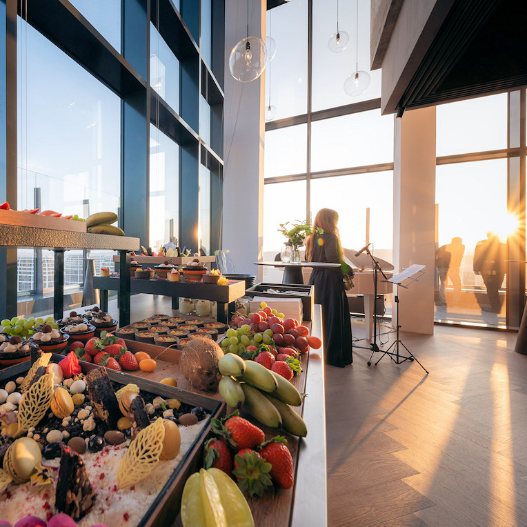 Vystúpte na terasu a nechajte sa uniesť atmosférou, kde panoráma mesta tvorí exkluzívne pozadie pre vaše podujatia. Otvorený priestor s nádherným výhľadom vytvára pre vašich hostí naozaj nezabudnuteľný zážitok.