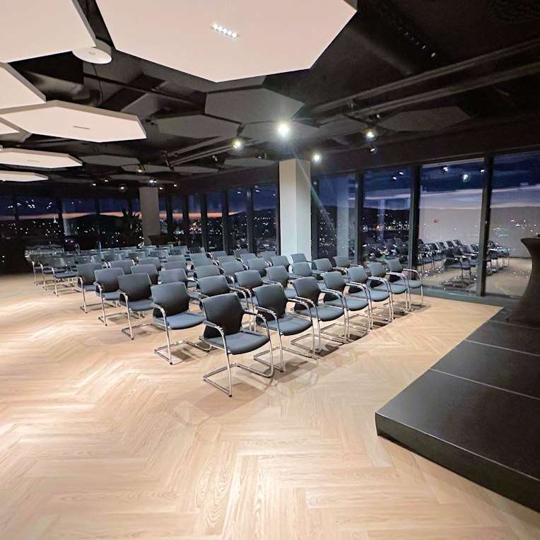 Hlavný Event space je všestranný a ľahko prispôsobiteľný vašim predstavám – ideálny na večierky, konferencie či networkingové stretnutia. Vďaka najmodernejšej audiovizuálnej technike vaše prezentácie ožijú a zanechajú trvalý dojem na publikum.